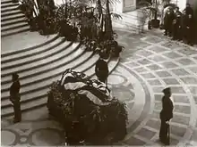 In the moments before his death, Funston was relaxing in the lobby of the St. Anthony Hotel[16] in San Antonio, listening to an orchestra play The Blue Danube waltz. After commenting, "How beautiful it all is," he collapsed from a massive heart attack and died. He was holding six-year-old Inez Harriett Silverberg in his arms.[17][18]