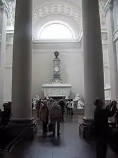 After lying in state with great pomp at the chapel at Christiansborg Palace in Copenhagen, he was interred next to Queen Louise in Roskilde Cathedral on the island of Zealand, the traditional burial site for Danish monarchs since the 15th century.[24] His monument in Roskilde cathedral was completed in 1769, and designed by the Danish sculptor Johannes Wiedewelt. It includes a large sarcophagus resting on footpieces and decorated by numerous sculptures, behind which is a column topped of an urn, a medallion with the king's portrait, and on each side of the sarcophagus, sitting approx. 9' high above the floor, are two crowned, grieving female figures representing Denmark and Norway. The memorial chapel in which it is placed was created as a collaboration between Wiedewelt and the Danish architect Caspar Frederik Harsdorff.
