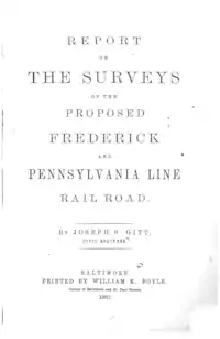 - Gitt (1867). Report of the Surveys and Location for the Frederick and Pennsylvania Line Railroad. Baltimore, MD: William K. Boyle. p. 1.