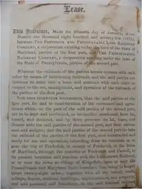 In April 1872 the state legislature revised Frederick's charter to allow any railroad in the city such as either the Baltimore and Ohio, or the Frederick and Pennsylvania Line to construct track on any of the city's streets, lanes, or alleys.[12] Although the right of way for the track had been granted through Frederick, the railroad then had to negotiate with the connecting railroad (Baltimore and Ohio Railroad).[13]