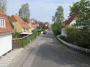 The area now contains 110 homes. The architecture is strongly influenced by the Bedre Byggeskik, a Danish version of the Arts and Crafts movement.[2]