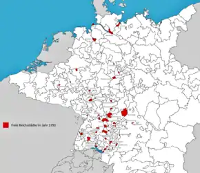 The following list contains the 50 free imperial cities that took part in the Imperial Diet of 1792. They are listed according to their voting order on the Rhenish and Swabian benches.[9]