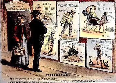 Free silver was a major economic policy issue in the United States in the late 19th-century. Its advocates were in favor of an expansionary monetary policy featuring the unlimited coinage of silver into money on-demand, as opposed to strict adherence to the more carefully fixed money supply implicit in the gold standard. Free silver became increasingly associated with populism, unions, and the fight of ordinary Americans against the bankers and monopolists, and the robber barons of the Gilded Age capitalism era and was referred to as the "People's Money".