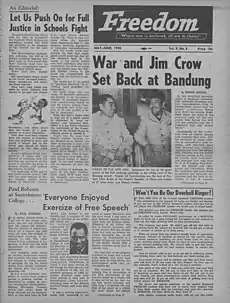 Freedom was a monthly newspaper focused on African-American issues published between 1950–1955. The publication was associated primarily with the internationally renowned singer, actor and then officially disfavored activist Paul Robeson, whose column, with his photograph, ran on most of its front pages. Freedom's motto was: "Where one is enslaved, all are in chains!"[1] The newspaper has been described as "the most visible African American Left cultural institution during the early 1950s."[2] In another characterization, "Freedom paper was basically an attempt by a small group of black activists, most of them Communists, to provide Robeson with a base in Harlem and a means of reaching his public... The paper offered more coverage of the labor movement than nearly any other publication, particularly of the left-led unions that were expelled from the CIO in the late 1940s... [It] encouraged its African American readership to identify its struggles with anti-colonial movements in Africa, Asia, and the Caribbean. Freedom gave extensive publicity to... the struggle against apartheid."[3]