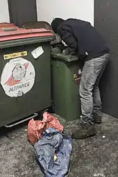 The legality of freegan practices of reclaiming wasted food, space, or buildings varies depending on local laws around property, trespassing, and waste removal.[37] In some places, like New York City, freegans dumpster dive publicly; in other locations, urban foraging is a secretive activity. In recent years, there have been arrests of people dumpster diving for political reasons in the United Kingdom,[38] Belgium,[39] and France,[40] although in most locations charges have eventually been dropped. These actions could be seen as part of a broader criminalization of acts of survival—like sleeping in public places, sharing food without a permit, or recovering aluminum cans to re-sell—that has affected freegans as well as affiliated groups like Food Not Bombs and the homeless.[14] Freegans report that stores have responded to waste recovery as well, including deliberately destroying products prior to disposing of them,[41] locking dumpsters, or pouring bleach on food to make it inedible. In France, a new national law bans the practice of destroying food in this way.[42]