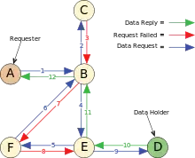 The Freenet file sharing network stores documents and allows them to be retrieved later by an associated key, as is now possible with protocols such as HTTP. The network is designed to be highly survivable. The system has no central servers and is not subject to the control of any one individual or organization, including the designers of Freenet. The codebase size is over 192.000 lines of code.[29] Information stored on Freenet is distributed around the network and stored on several different nodes. Encryption of data and relaying of requests makes it difficult to determine who inserted content into Freenet, who requested that content, or where the content was stored. This protects the anonymity of participants, and also makes it very difficult to censor specific content. Content is stored encrypted, making it difficult for even the operator of a node to determine what is stored on that node. This provides plausible deniability; which, in combination with request relaying, means that safe harbor laws that protect service providers may also protect Freenet node operators. When asked about the topic, Freenet developers defer to the EFF discussion which says that not being able to filter anything is a safe choice.[30][31]