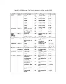 Freestyle was a contemporary art exhibition at The Studio Museum in Harlem from April 28-June 24, 2001 curated by Thelma Golden with the support of curatorial assistant Christine Y. Kim. Golden curated the works of 28 emerging black artists for the exhibition, characterizing the work as ‘Post-Black’. The latter is a term she generated along with artist Glenn Ligon as a genre of art “that had ideological and chronological dimensions and repercussions. It was characterized by artists who were adamant about not being labeled as 'black' artists, though their work was steeped, in fact deeply interested, in redefining complex notions of blackness."[1] Freestyle was her first major project at The Studio Museum in Harlem and the first of an ongoing series of ‘F’ themed exhibitions including Frequency, Flow and Fore. The most recent iteration of the series was 2017's Fictions.