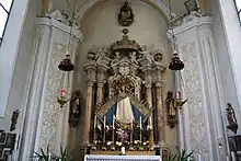 Trens is also a place of pilgrimage, the church is dedicated to the miraculous image of “Our Lady of the Avalanche”, the ancient wooden statue of the “Madonna standing and the Child”, dating back to 1470. According to a legend, a farmer found a wood-carved statue among the debris of a landslide and carried it to his house. The following day the statue was found in a chapel and the people began to venerate it. In a document dated 10 September 1345, it is mentioned for the first time of a church in Trens, in 1407 the family Trauston appointed a weekly Mass to be celebrated on Tuesday in the church. The present church was built in 1498 in Late Gothic with two main entrances; the priest of Stilves obtained a “littera indulgentiarum” from twelve cardinals in 1482 in order to ease the construction. The chaplain of the deanery of Trens received in 1648 the commission to say Mass every day in Trens and the pilgrimages to the church increased. The “Chapel of Our Lady” was inaugurated on 29 March 1728, and take place on the left side of the nave with the wall covered by the numerous votive offering. At the half of the 18th century, the church underwent a restoration in Baroque on a plan by Joseph Adam Ritter von Mölk. The miraculous image was crowned in 1928 and the church became a parish in 1939.[6]