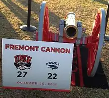 The Fremont Cannon is the trophy awarded to the winner of the Battle for Nevada (also known as the Nevada–UNLV football rivalry), an American college football rivalry game played annually by the Nevada Wolf Pack football team of the University of Nevada, Reno (Nevada) and the UNLV Rebels football team of the University of Nevada, Las Vegas (UNLV). The trophy was built in 1970 and is a replica of a 19th-century Howitzer cannon that accompanied American explorer and politician John C. Frémont on an expedition to the American West and Nevada in the mid 19th century. The original cannon had been abandoned, due to heavy snows, in the Sierra Nevada in 1843. The replica cannon was originally fired following a touchdown by the team in possession of the cannon, but it has been inoperable since 1999. The wooden carriage is painted the school color of the team in possession, navy blue for Nevada or scarlet for UNLV. The trophy is the heaviest and most expensive in college football.[1] Since 2012, the game is also part of the Silver State Series (formerly Governor's Series), the series of athletic competitions between the two schools.