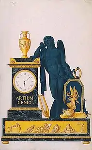 The classical gods served as models and symbols for the era. For instance, the chariot clocks or "pendules au char" were an exceptional category within the Empire clocks. Apollo, Diana and Cupid depicted as triumphant chariot drivers, were the most popular gods used. It was habitual during the Napoleonic times and particularly under the "Directoire" and "Consulat" regimes that clocks glorify the conduct of warfare.[4]