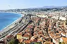 Officially, the French Riviera is home to 163 nationalities with 83,962 foreign residents,[6] although estimates of the number of non-French nationals living in the area are often much higher.[7] Its largest city is Nice, which has a population of 340,017 as of 2017.[8] The city is the centre of a métropole—Nice-Côte d'Azur—bringing together 49 communes and more than 540,000 inhabitants and 943,000 in the urban area. Nice is home to Nice Côte d'Azur Airport, France's third-busiest airport (after Charles de Gaulle Airport and Orly Airport), which is on an area of partially reclaimed coastal land at the western end of the Promenade des Anglais. A second airport at Mandelieu was once the region's commercial airport,[9] but is now mainly used by private and business aircraft.[10]