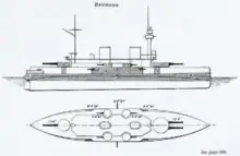 Brennus was the first pre-dreadnought-style battleship built in the French Navy; the previous Magenta-class ships were barbette ships, a type of ironclad battleship.[3] The ship introduced several advances for the French fleet: new, 42-caliber guns arranged in turrets forward and aft of the superstructure, the first use of homogeneous steel armor, and the first Belleville boilers. Other changes included the adoption of a thin upper strake of armor to protect against quick-firing guns and the abandonment of the ram bow.[4] Brennus formed the basis for the subsequent group of five broadly similar battleships built to the same design specifications, begun with Charles Martel, though they reverted to the armament layout of the earlier Magentas which saw the main guns distributed in single turrets in a lozenge (quadrilateral) pattern.[5]