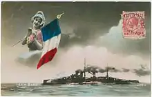 Jean Bart was ordered on 11 August 1910[7] and named after the privateer Jean Bart.[8] She was laid down on 15 November 1910 at the Arsenal de Brest and launched on 22 September 1911. The ship was completed on 2 September 1913 at a cost of F60,200,000 and visited Dunkerque, the birthplace of her namesake on 18 September. She was commissioned into the fleet on 19 November together with her sister Courbet. They were assigned to the 1st Battle Division (1ère Division de ligne) of the 1st Battle Squadron (1ère Escadre de ligne) of the 1st Naval Army (1ère Armée Navale), at Toulon in mid-November. Jean Bart steamed to Brest on 24 June 1914 to rendezvous with her sister France, who had not yet finished her trials. Raymond Poincaré, President of the French Republic, boarded France on 16 July for a state visit to Saint Petersburg, Russia. After encountering the battlecruisers of the German I Scouting Group in the Baltic Sea en route, the ships arrived at Kronstadt on 20 July. They made a port visit to Stockholm, Sweden, on 25–26 July, but a planned visit to Copenhagen, Denmark, was cancelled due to rising tensions between Austria-Hungary and Serbia and the ships arrived at Dunkerque on 29 July.[9]