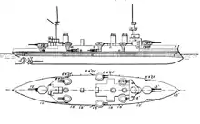 The ship's main belt was 280 mm (11.0 in) thick in the central citadel, and was connected to two armored decks; the upper deck was 54 mm (2.1 in) thick while the lower deck was 51 mm (2.0 in) thick, with 70 mm (2.8 in) sloped sides. The main battery guns were protected by up to 360 mm (14.2 in) of armor on the fronts of the turrets, while the secondary turrets had 138 mm (5.4 in) of armor on the faces. The conning tower had 266 mm (10.5 in) thick sides.[2]