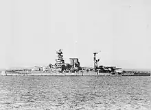 Richelieu returned fire at 09:40, but her No. 7 gun was destroyed by a shell that detonated in the barrel and the No. 8 gun was also badly damaged. This was first traced to the use of the remanufactured propellant from Strasbourg, but a later inquiry in 1941 found the explosions were caused by a flaw in the design of the shell base.[25][26] Guns 5 and 6 remained in action but failed to score any hits. At 09:57, one of Richelieu's secondary guns hit Barham. In return, the British ships inflicted only minor splinter damage before breaking off at 10:07. The French had counted some 160 shells landing near the ship. The French laid smoke screens to obscure Richelieu before the British returned to the action at 12:53, initially targeting a destroyer before bombarding the port for the next 30 minutes. Richelieu was not hit and, from 12:56, she fired guns 5 and 6 at the British cruisers, quickly straddling one of them and convincing them to disengage. She fired four 380 mm shells at Barham at 13:11–13:12 but failed to score a hit, though both British battleships were hit several times by coastal batteries. After disengaging for the day, de Gaulle decided to abandon the operation, but Cunningham convinced him to allow a final attempt the next morning. In the meantime, Marzin decided to transfer the crews from turret 2 to turret 1, which also required moving the shells and propellant between magazines.[27][28]
