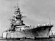 She was armed with eight 380 mm/45 Modèle (Mle) 1935 guns arranged in two quadruple gun turrets,[lower-alpha 1] both of which were placed in a superfiring pair forward of the superstructure. Her secondary armament consisted of nine 152 mm (6 in) /55 Mle 1930 guns mounted in three triple turrets, arranged on the rear superstructure. Heavy anti-aircraft (AA) defense consisted of twelve 100 mm (3.9 in) /45 Mle 1930 anti-aircraft guns in twin turrets. Close range anti-aircraft defense was provided by a battery of eight 37 mm (1.5 in) guns in twin mounts and twenty 13.2 mm (0.52 in) machine guns in four quadruple and two twin mounts. The ship's belt armor was 330 mm (13 in) thick amidships, and the main battery turrets were protected by 430 mm (17 in) of armor plate on the faces. The main armored deck was 170 mm (6.7 in) thick, and the conning tower had 340 mm (13 in) thick sides.[2][4]