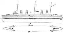 The ship's propulsion system consisted of three vertical triple-expansion steam engines driving three screw propellers; she was the first French protected cruiser to adopt a three-shaft arrangement.[6] Steam was provided by thirty-six mixed oil- and coal-burning, Lagrafel d'Allest water-tube boilers. These were divided into two widely-spaced groups and both groups were ducted into a pair of funnels. It was further development of an arrangement first used in D'Entrecasteaux, and symmetrical silhouette became a trademark of most following French large cruisers.[7] Her machinery was rated to produce 24,000 indicated horsepower (18,000 kW) for a top speed of 23.5 knots (43.5 km/h; 27.0 mph), and she reached 25,163 ihp (18,764 kW) for 23.54 knots (43.60 km/h; 27.09 mph) during her initial speed tests. Coal storage amounted to 1,680 t (1,650 long tons; 1,850 short tons), which provided her a cruising radius of 8,430 nautical miles (15,610 km; 9,700 mi) at a speed of 10 knots (19 km/h; 12 mph).[3][5]