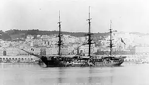 The ship was propelled by a single horizontal, 3-cylinder compound steam engine that drove a screw propeller. Steam was provided by eight coal-burning fire-tube boilers that were ducted into a single funnel located amidships. The power plant was rated to produce 2,240 indicated horsepower (1,670 kW), but during her initial speed testing, they reached 2,467 ihp (1,840 kW) for a top speed of 13.35 knots (24.72 km/h; 15.36 mph). The ship carried 435 t (428 long tons) of coal, and at a cruising speed of 10 knots (19 km/h; 12 mph), Iphigénie could steam for 5,200 nautical miles (9,600 km; 6,000 mi). To supplement her steam engines, she was fitted with a three-masted full ship rig.[3][4]