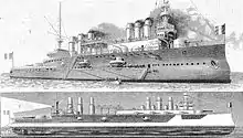 Jeanne d'Arc was originally conceived in the early 1890s as a large protected cruiser for overseas service, but the design was recast as an armoured cruiser by the naval architect Emile Bertin, director of the Navy's Technical Section (Section technique) in 1895.[1] His design is regarded as unsuccessful with too light an armament for her size and failing to achieve her designed speed.[2][3] The ship measured 147 metres (482 ft 3 in) long overall with a beam of 19.42 metres (63 ft 9 in) and had a maximum draught of 8 metres (26 ft 3 in). She displaced 11,264 tonnes (11,086 long tons) at normal load and had a metacentric height of 1.458 metres (5 ft). The hull was subdivided by 15 watertight bulkheads that extended from her double bottom to the main armoured deck.[4] Jeanne d'Arc had a crew of 651.[3]