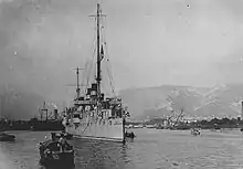 In May 1913, Jurien de la Gravière was mobilized to join the active component of the Mediterranean Fleet, serving in the role of répétiteur (signal relay ship).[8] She sailed on 20 October in company with the battleships of the 1st Squadron and six torpedo boats to make a show of force during a period of tension between Italy and the Ottoman Empire. The French ships visited Alexandria, Egypt, where they were visited by thousands of people. They then steamed north past Cyprus on 3 November, then back west to Messina, Italy, two days later. On the way there, they met the German battlecruiser SMS Goeben. The fleet then returned to the eastern Mediterranean, visiting a series of ports in Ottoman Syria. The ships then steamed to the Dardanelles straits, where the commander, Admiral Augustin Boué de Lapeyrère, transferred from his flagship, the pre-dreadnought Voltaire, to Jurien de la Gravière, to enter the straits and make an official visit to the Ottoman capital, Constantinople. The fleet then sailed to Salamis, Greece, to meet King Constantine I of Greece aboard his fleet's flagship, the armored cruiser Georgios Averof on 28 November. After a week visiting other Greek ports, the French vessels stopped in Porto-Vecchio in Corsica before rejoining the rest of the Mediterranean Fleet at Porquerolles. They arrived back in Toulon finally on 20 December.[23]