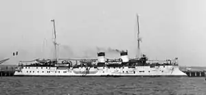 The following year, she was joined there by the protected cruiser Infernet and the transport vessel Aube.[10] Protet was in San Francisco in the United States in 1900 when a fire broke out in the harbor; Protet sent men ashore to help suppress the blaze, prompting the city's mayor to send a note of thanks to the French government.[11] While she was in that city in April and May, she received four electric ventilators to improve the habitability of the ship during its long voyages in the tropics.[3] Protet was still serving in the Naval Division of the Eastern Pacific by January 1901, which also included the gunboat Zélée and four transport vessels.[12] In October that year, she went to Panama City, then still part of Colombia, to protect French interests during the Thousand Days' War; she met vessels from other navies, including the United States pre-dreadnought battleship USS Iowa and the British sloop HMS Icarus. On the Caribbean side of the isthmus of Panama, at Colón, the French cruiser Suchet and the United States gunboat USS Machias also awaited developments in the conflict.[13] In December, Protet steamed north to the United States' Mare Island Naval Shipyard in California to replenish coal and supplies.[14]