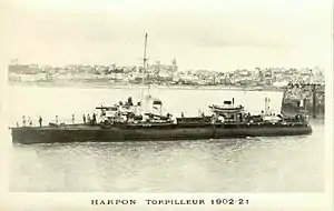 When the First World War began in August 1914, Harpon was in the reserve of the 2nd Light Squadron (2e escadre légère)[6] based at Cherbourg. The ship was not mobilized until later in the year and wa assigned to the Dunkirk Flotilla.[5]