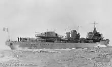 On 24 November, a five-man liaison team from the Royal Australian Navy boarded the ship in Melbourne.[19] Le Triomphant departed Fremantle the following day to return to the Mediterranean, accompanied by the American oil tanker SS Cedar Mills. A few days later, an accident while starting to refuel damaged the oil transfer gear, which meant that the cruiser only had 170 metric tons (170 t) of fuel in her tanks; to conserve fuel, Cedar Mills started towing Le Triomphant. The transfer gear was finally repaired on 1 December and she was able to top off her oil tanks. During the night of 2/3 December, the ships were struck by a typhoon and Le Triomphant was badly damaged. She took on a 15 degree list and her forward boiler and engine rooms were flooded. After taking off some of the crew, Cedar Mills was able to re-establish the tow on 5 December. The heavy cruiser HMS Frobisher took over the task and towed the large destroyer to Diego Suarez, French Madagascar, on 19 December. Temporary repairs there took until 21 February 1944 when she sailed for Boston, Massachusetts, for permanent repairs that lasted for a year after her arrival there on 12 April.[20] En route, Le Triomphant stopped at Algiers where she was inspected by General Charles de Gaulle, leader of the Free French, and the High Commissioner for the Navy, Louis Jacquinot.[19] Ordered to the Indian Ocean in 1945, she served with the Eastern Fleet after her arrival in Colombo, Ceylon, on 27 May. After a brief refit in Diego Suarez in July, she covered the British occupation of Singapore in early September together with the French battleship Richelieu.[21]