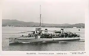 Sabre was a Arquebuse-class destroyer contre-torpilleur d'escadre built for the French Navy in the first decade of the 20th century. Completed in 1904, the ship was initially assigned to the Far Eastern Division (Division Navale d’Extrême-Orient). She returned to France in 1907 and was assigned to the Northern Squadron (Escadre du Nord). Sabre became part of a local defense unit (Défense mobile) in Brittany four years later.