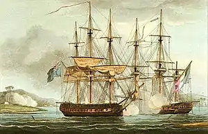 On 19 August HMS Sibylle, Captain Charles Adam, chased her off Mahé, Seychelles. At the time of the British attack Chiffonne was at anchor and aided her defense by constructing a battery using some of her forecastle guns and heating the shot.[2] Her captain, Commander Guiyesse, attempted to avoid capture by beaching Chiffonne, but the British captured her the next day. She had lost 23 men killed and 30 wounded; Sybille lost two men killed and one wounded.[2] She was brought into British service as HMS Chiffonne. When Adams arrived in Madras with his prize the insurance company there presented him with a sword worth guineas, while the merchants of Calcutta later too presented him with a sword and a piece of plate.[4]