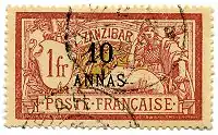10-anna overprint on a 1-franc Type Merson, postmarked Zanzibar in 1903
