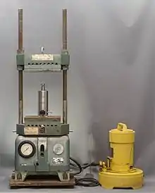 The French pressure cell press, or French press, is an apparatus used in biological experimentation to disrupt the plasma membrane of cells by passing them through a narrow valve under high pressure.[1] The French Press can also be used for disintegration of chloroplasts, homogenates of animal tissue, and other biological particles. It is capable of disrupting cell walls while leaving the cell nucleus undisturbed. The French press was invented by Charles Stacy French of the Carnegie Institution of Washington.[2] The press uses an external hydraulic pump to drive a piston within a larger cylinder that contains the liquid sample. The highly pressurized sample is then squeezed past a needle valve. As the sample passes through the valve, the fluid experiences shear stress and decompression, causing cellular disruption. The major components of a French press are made of stainless steel to prevent sample contamination.