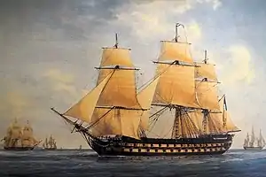 In April 1809, Ville de Varsovie was part of the French Atlantic Fleet blockaded in Basque Roads at the mouth of the Charente on the Biscay coast of France by a Royal Navy squadron. On the afternoon of 12 April, during the Battle of Basque Roads, Ville de Varsovie was aground on rocks at low tide in Basque Roads near Charenton when British warships attacked.[1] After two hours of pounding by the British fleet with little chance to fire back, Ville de Varsovie surrendered after her crew suffered about 100 casualties,[2][3] and the British 74-gun third rate ship of the line HMS Revenge captured her.[4] Although the leader of the British attack, Lord Thomas Cochrane, disapproved of the decision, the commanding officer of the 74-gun third rate ship of the line HMS Valiant, Captain John Bligh, deemed Ville de Varsovie beyond repair and set her afire during the night of 12–13 April 1809. The fire completed the destruction of Ville de Varsovie during the predawn hours of 13 April 1809.[5]