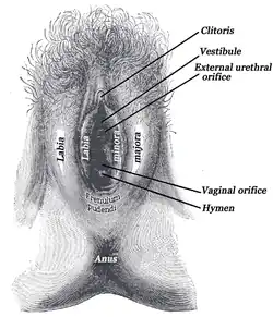 ![]() External genital organs of female. The labia minora have been drawn apart (frenulum of labia minora is labeled as Frenulum pudendi) | |