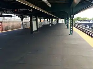 This elevated station has two tracks and an island platform. The platform is wider than those in most other stations in the system because the station was formerly a major transfer point to the Flushing–Ridgewood streetcar Line to Flushing.[6] This service was replaced by the Q58 bus on July 17, 1949.[7]