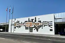 Construction started on a new, larger passenger terminal in 1959 on the south side of the field.[6] The building was a long, simple shape that housed a baggage claim area, a central lobby, and a ticketing area. The $1.5 million terminal had long walls of glass for the baggage claim and the ticketing areas, which book-ended the central lobby of solid masonry block which bears a venetian glass mosaic called "Sky and Ground" from Raymond Rice.[10][11] From the central lobby, passengers used a tunnel to reach the open-air, remote concourse where they boarded planes from ground level.[6] The terminal opened on March 28, 1962 and shortly after received an award from the San Joaquin Valley Chapter of the American Institute of Architects.[12] Although renovated, the original terminal building is still in use today for the same functions that it was designed for. The current air traffic control tower was built around the same time as the terminal and opened in 1961.[6]