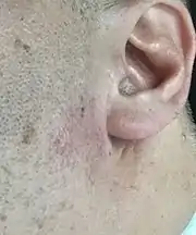 Rarely, Frey's syndrome can result from causes other than surgery, including accidental trauma, local infections, sympathetic dysfunction and pathologic lesions within the parotid gland.[4] An example of such rare trauma or localized infection can be seen in situations where a hair follicle has become ingrown, and is causing trauma or localized infection near or over one of the branches of the auriculotemporal nerve.