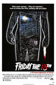 A full one-sheet poster, featuring a group of teenagers imposed beneath the silhouette of a knife-wielding figure, was designed by artist Alex Ebel to promote the film's U.S. release.[33] Scholar Richard Nowell has observed that the poster and marketing campaign presented Friday the 13th as a "light-hearted" and "youth-oriented" horror film in an attempt to draw interest from America's prime theater-going demographic of young adults and teenagers.[34] Warner Bros. secured distribution rights to the film in international markets.[29][35]