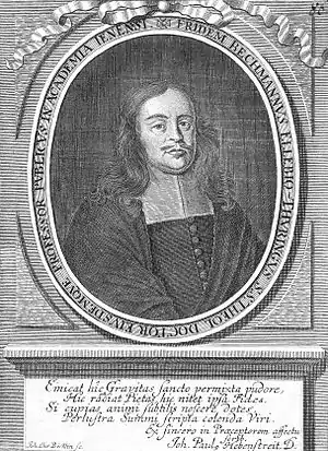 In 1649 Bechmann transferred to the University of Jena where he enrolled to study Philosophy and Theology. On 5 August 1651 he was awarded his Magister degree.[2] In the Philosophy faculty he attended lectures and tutorial sessions presented by Johann Zeisold (1599–1667), Daniel Stahl (1589–1654), Paul Slevogt (1596–1655) and Johann Christfried Sagittarius (1617–1689). Over in the Theology faculty, those who taught him included Johannes Musaeus (1613–1681), Christian Chemnitz (1615–1666) and Johann Ernst Gerhard the elder.