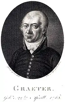 A native of Schwäbisch Hall, Gräter studied theology, philosophy, and philology in Halle and Erlangen. He worked as a gymnasium teacher of Greek and Hebrew in Schwäbisch Hall from 1804 as rector. He was a member of Pegnesischer Blumenorden from 1781 and member of the Berlin Academy of Sciences from 1792. He married Christiane Spittler in 1799. They had no children and divorced in 1803. In 1805, Gräter married Maria Elisabetha, née Hofmann, widowed Seiferheld und Haspel, with whom he had a daughter.[1] In 1818, he became rector of the gymnasium at Ulm. He retired in 1826 and moved to Schorndorf.