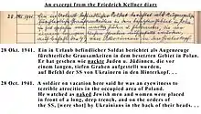 One of the most important historical entries in the diary was written on 28 October 1941. Most Germans after the war would insist they knew nothing at all about the state-sponsored genocide of the Jews,[14] yet very early in the war Kellner recorded this in his diary, showing that word of atrocities reached the average citizens even in the small towns: