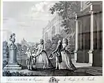 Louis Philippe II, Duke of Orléans, the son of Grimm's employer, helped the Mozarts perform in Versailles, where they stayed for two weeks over Christmas and New Year.[36] Hermann Abert explains that "only when they had performed at Versailles were they admitted to, and admired by, aristocratic circles." Grimm recounted with pride the impressive improvisations produced by young Mozart in private and public concerts. Leopold had four of his sonatas for keyboard and violin engraved and dedicated to King Louis XV's daughter, Madame Victoire, and the Dauphine's lady-in-waiting, by "THEOPH:W:MOZART Compositeur, et Maitre de Musique, agé de 7 ans". In 1766, Carmontelle produced a group portrait of the family performing, engraved at Grimm's instigation. In 1777, Michel-Barthélémy Ollivier painted Wolfgang playing the pianoforte in the Prince of Conti's salon at the Temple, a painting now in the Louvre Museum.[37]