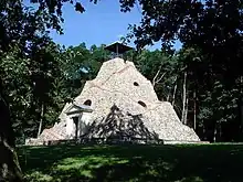 During his temporary retirement, Schmettau worked as a cartographer and topographer just as his father had and created some of the highest-quality maps of the Prussian realm at the time. He was described as a pioneer of modern cartography.[2] Schmettau also found himself entangled in a famous legal scandal during the reign of Frederick II, better known as Frederick the Great, where one of his tenants had refused to pay rent after local carp-ponds had cut off the stream to his mill-wheel. The local courts and even the high court of the Prussian state ruled in Schmettau's favor, due to his noble status, only for Frederick himself to personally rule in favor of the tenant and imprison the corrupt jurors.[3] Schmettau had also constructed a pyramid in Garzau after purchasing the estate in 1779, it still stands today and is the largest fieldstone pyramid in Germany.