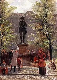In 1851, Frederick William IV, Frederick's great-great nephew, included Seydlitz's name on the Equestrian statue of Frederick the Great in Berlin, honoring those who had helped to build the Prussian state. Seydlitz holds a position of honor as one of the four full-sized mounted figures, sharing the first tier of the plinth with the King's brother, his cousin, and Hans Joachim von Zieten.[25] A bronze sculpture installed at Wilhelmplatz, in Berlin, was created by Anton Lulvès, a copper worker from Hamburg.[26] SMS Seydlitz, representing the first generation of battlecruisers, was ordered in 1910 and commissioned in May 1913, the fourth such vessel built for the Imperial German Navy's High Seas Fleet.[27] The heavy cruiser Seydlitz, of the Admiral Hipper class, was launched in 1939, but never completed.[28]
