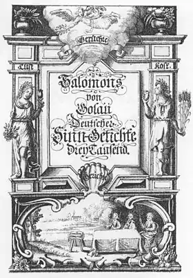 Logau's epigrams show a range and variety of expression. They appeared in two collections under the pseudonym Salomon von Golaw (an anagram of his real name, referring to Gohlau and the Proverbs of Solomon) in 1638 (Erstes Hundert Teutscher Reimensprũche) and 1654 (Deutscher Sinngedichte drei Tausend). He had suffered under the adverse conditions of the time; but his satire is not merely the outcome of personal feeling. In the turbulent age of the Thirty Years' War he was one of the few men who preserved intact his intellectual integrity and judged his contemporaries fairly. He satirized with unsparing hand the court life, the useless bloodshed of the war, the lack of national pride in the German people, and their slavish imitation of the French in customs, dress and speech.[1]