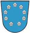 Friedrichsdorf was given its first civic coat of arms in 1821 in remembrance of Russian Princess Alexandra's – and her eight guests' – visit to Count Friedrich in Bad Homburg: In azure a ring of nine roses argent (i.e. a blue shield with a ring of nine silver roses).