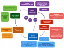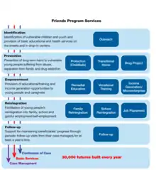 Friends-International runs a holistic and inclusive social services program supporting the development of children, youth, their families and communities that impacts over 30,000 beneficiaries a year in Cambodia, Thailand, Laos and Indonesia.[14] The Friends program is defined by a range of services that respond to the many challenges that marginalized young people face, namely abuse, sickness, drug use, exclusion from educational and training opportunities, child labor, poverty and separation from family. The program consists of a continuum of care in which beneficiaries build gradually to the end result of reintegration. Program services are facilitated through a comprehensive case management system (individualized support to each beneficiary by an assigned case manager) and ongoing access to basic services (health checkups, non-formal education, awareness building, counseling).