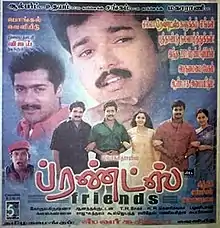Friends is a 2001 Indian Tamil-language drama film, directed by Siddique in his Tamil debut and produced by Appachan. It is the Tamil remake of Siddique's own 1999 Malayalam film of the same name. The film stars Vijay, Suriya and Ramesh Khanna as the friends, while Devayani, Vijayalakshmi, Abhinayashree, Sriman, Vadivelu, Charle, and Radha Ravi play supporting roles. The music was composed by Ilaiyaraaja, while Anandakuttan handled cinematography.