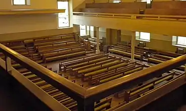 Meeting Houses built in a traditional style usually had two meeting rooms: one for the main meeting for worship, and another where the women's business meeting may be held (often referred to as the women's meeting room). Meeting houses of this style usually have a minister's gallery at one end of the meeting room, where traditionally those traveling in the ministry would have sat, with an elders bench immediately in front of this. Wooden benches facing this occupy the rest of the room, often with a gallery for extra seating. Meeting houses of this style usually have high windows so that worshippers sitting in meeting for worship cannot see outside.