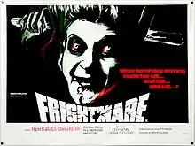 Frightmare (also known as Cover Up and Once Upon a Frightmare) is a 1974 British psychological horror slasher film directed and produced by Pete Walker, written by David McGillivray and starring Rupert Davies and Sheila Keith.[1] The story focuses around Dorothy and Edmund Yates, who have recently been released from a mental asylum, and is one of Pete Walker's most notable films.[2][3]