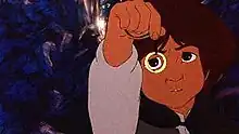 Frodo appears in adaptations of The Lord of the Rings for radio, cinema, and stage. In Ralph Bakshi's 1978 animated version, Frodo was voiced by Christopher Guard.[15] In the 1980 Rankin/Bass animated version of The Return of the King, made for television, the character was voiced by Orson Bean, who had previously played Bilbo in the same company's adaptation of The Hobbit.[16] In the "massive"[17] 1981 BBC radio serial of The Lord of the Rings, Frodo is played by Ian Holm, who later played Bilbo in Peter Jackson's film adaptation of The Lord of the Rings.[18] In Leningrad Television's two-part 1991 teleplay Khraniteli (Keepers [of the Ring]), Frodo was played by Valery Dyachenko,[19] while in the Finnish broadcaster Yle's 1993 television miniseries Hobitit, the role is played by Taneli Mäkelä.[20]